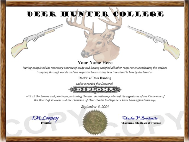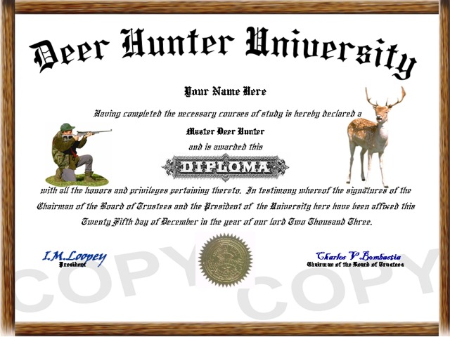 designed, affordable, high quality, custom novelty hunting diplomas and degrees.